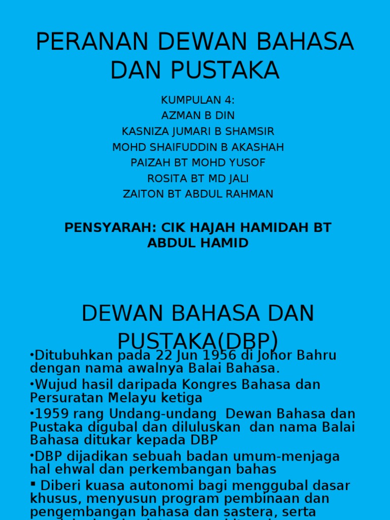 ديوان بهاس دان ڤوستاک), abbreviated dbp, is the government body responsible for coordinating through ordinan dewan bahasa dan pustaka 1959, dbp was granted a charter with its own board of governors.