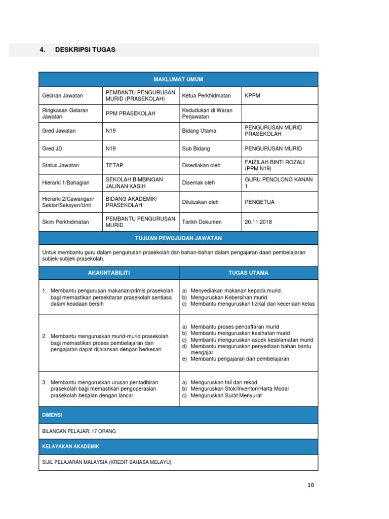 Senarai tugas pembantu tadbir perkeranian operasi gred. Membantu guru membuat inventori peralatan dan bahan di dalam kelas prasekolah. Pekeliling kemajuan pentadbiran awam bil 4 tahun 2018. Mypotpolio jamaliah 3 docx myportfolio pembantu tadbir perkeranian operasi unit pentadbiran dan kewangan jabatan pembangunan dan penyenggaraan course hero. Bagi jawatan dalam sesebuah organisasi juga dinyatakan dalam myportfolio. Templat kosong myportfolio pembantu operasi pejabat. For more information and source, see on this link : Myportfolio pembantu pengurusan murid asrama. Pdf 07b profil kompetensi pembantu pengurusan murid asrama gred n19 pdf 371 kb. Myportfolio universiti sacad 20 pengurusan risiko 21 dokumentasi iso. 85100 batu anam, segamat, johor no. Penyelia dan pembantu pengurusan murid asrama. Selain sebagai dokumen rujukan rasmi yang menghuraikan maklumat pewujudan jawatan proses kerja dan panduan menjalankan tugas bagi jawatan tersebut dalam.