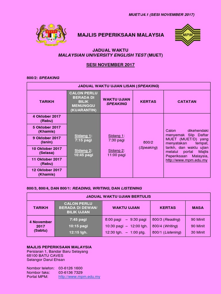 Muet 2017 exam dates (tarikh peperiksaan muet 2017). Saya nak tnye sikit??mcm mne nk dpt balik nmbr giliran muet kite??sbb sye dh terbuang slip muet tu. Semak slip daftar ujian (muet/d). Please be informed that the muet speaking test will be held on 10th & 11th october 2017. Live streaming super spontan superstar 2017 astro online. Carian maklumat buat calon yang kehilangan slip keputusan muet/ sijil muet di mana calon perlu muet merupakan peperiksaan yang dikelolakan oleh majlis peperiksaan malaysia (mpm). Kalendar exam muet 2017 menyatakan kepada semua calon muet tentang tarikh pendaftaran exam muet semoga kalendar muet ini bermanfaat untuk anda supaya dapat merancang masa belajar dengan lebih baik. Semakan pendaftaran muet november 2017 online. Semakan pendaftaran muet mac 2018 online| perhatian buat calon yang bakal menduduki peperiksaan muet sesi november 2017. Bagi semakan pendaftaran muet secara online dan sms bagi sesi 2 (julai 2021), akan dibuka bermula tarikh yang akan dikemaskini berdasarkan. Calon yang tidak berpuas hati dengan keputusan muet boleh membuat rayuan penyemakan semula keputusan muet dengan bayaran rm70, tarikh tutup rayuan semak semula. Anda calon muet sesi mac 2017? November logos october november born logo.